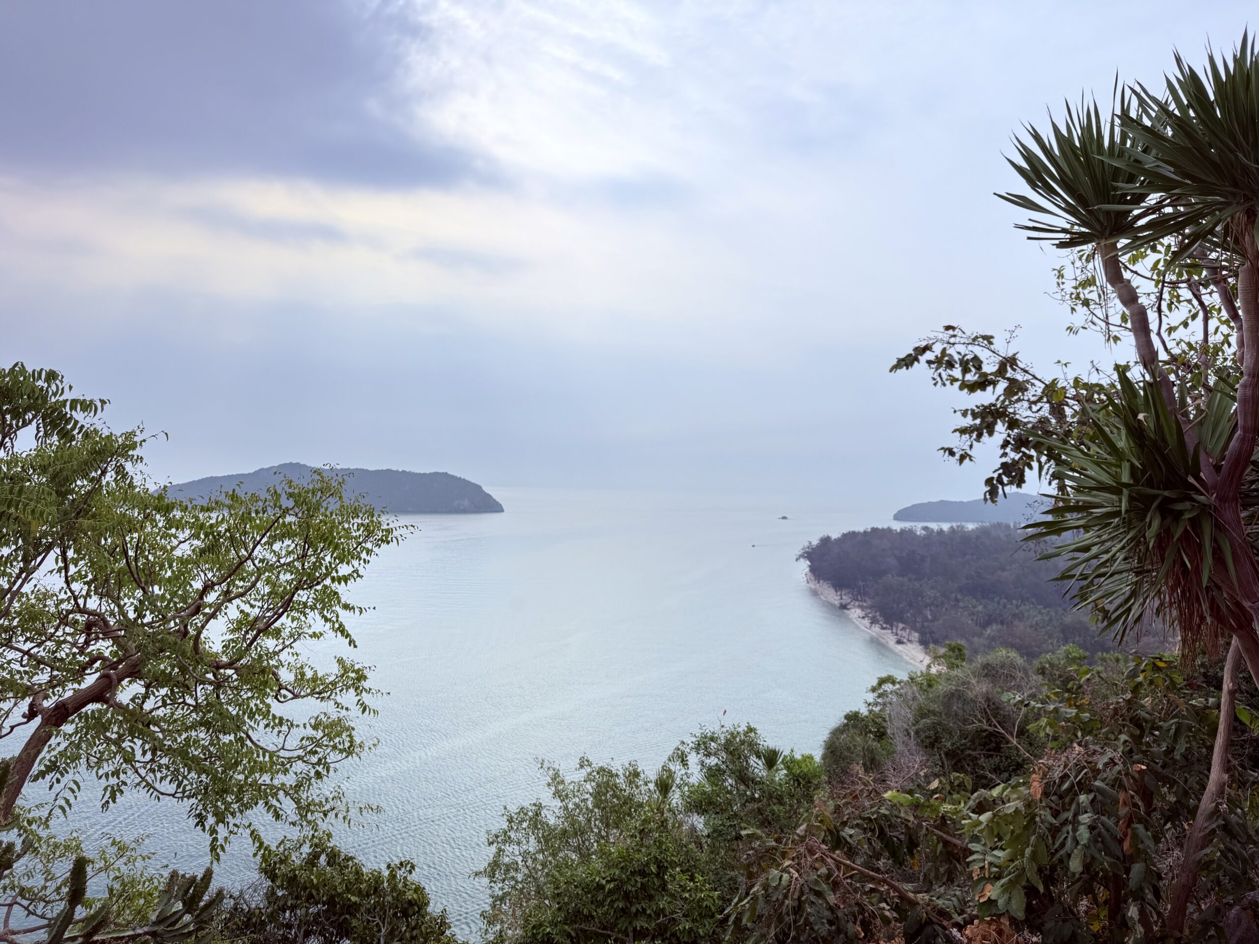 Oben angekommen – ging es nach einer Plattform auch schon wieder bergab. Als kurze Belohnung ein kurzer Spaziergang durch einen Palmenhain an einem kleinen, eingeschlossenen Strand entlang. Kurz durchatmen, Meer anschauen, so tun, als wäre man gar nicht außer Atem. Spoiler Nummer zwei: lange hält diese Pause nicht.