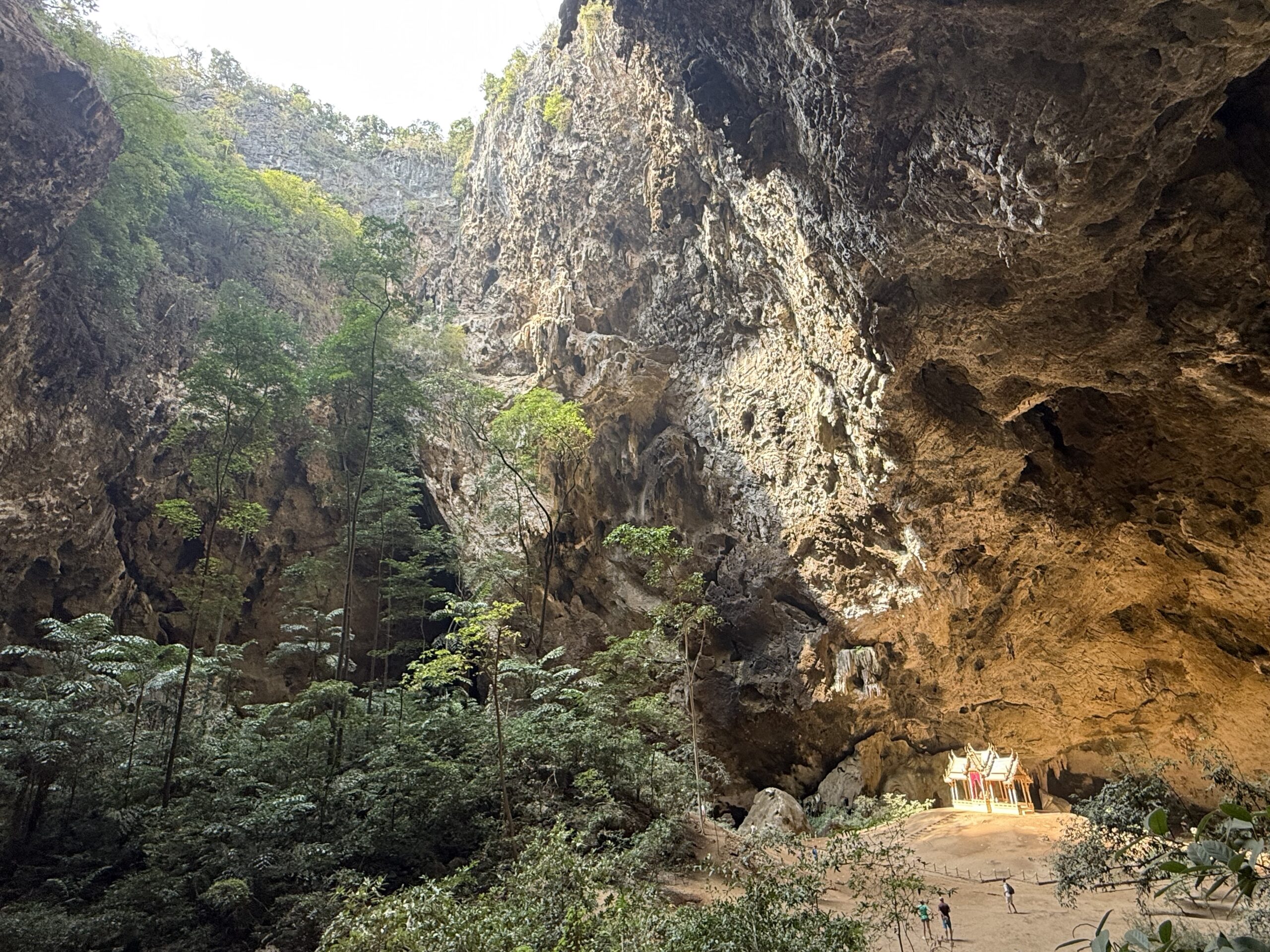 Und dann steht man plötzlich drin. In einer riesigen Höhle, offen nach oben, fast wie eine Tropfsteinhöhle ohne richtige Decke. Alles ist ruhig, kühl, fast feierlich. Ruhig steht er da, in der Mitte, der kleine königlichen Kuha Karuhas Pavilion der extra für einen Besuch von Rama V. gebaut wurde.